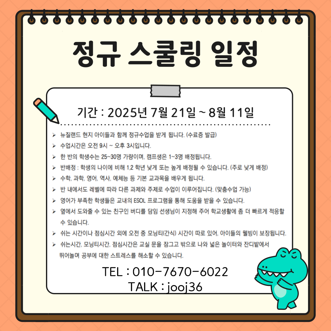 | 2025 뉴질랜드 영어캠프 방학 스쿨링 프로그램 일정 및 기간 [부모 동반 가능] (2) | 2025.03.31 |